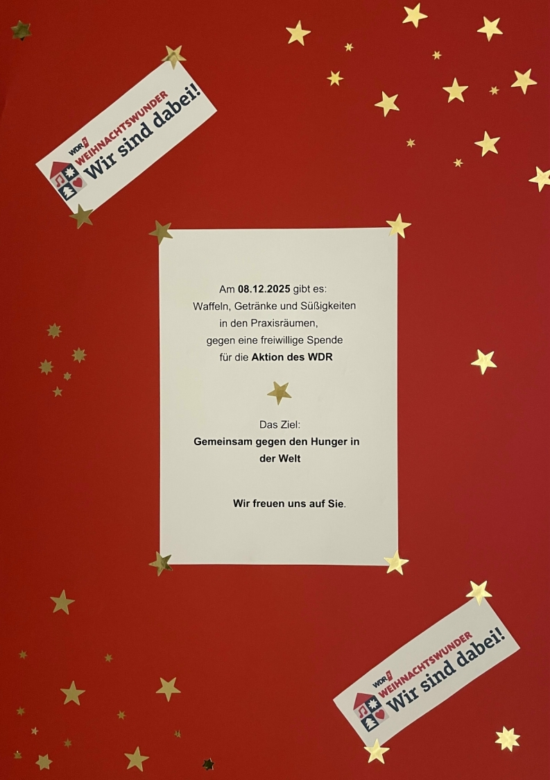 Am 08.12.25 gibt es Waffeln, Getränke und Süßigkeiten in den Praxisräumen gegen eine freiwillige Spende für die Aktion des WDR. Bitte auf das Bild klicken!